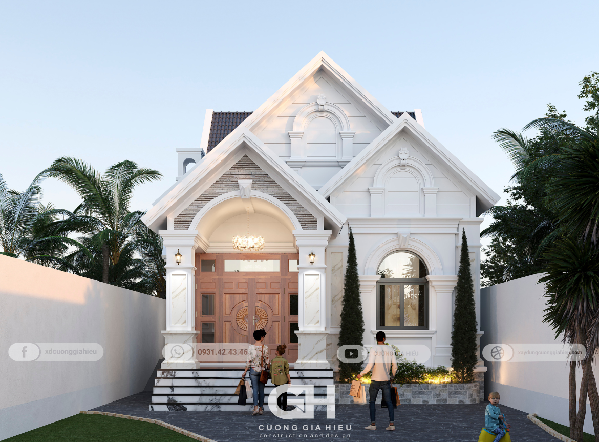 Tổng thể ngôi nhà được xây dựng với tông màu trắng chủ đạo, làm nổi bật các chi tiết phào chỉ và hoa văn trang trí tinh xảo. Sân vườn được lát gạch phẳng phiu, sạch sẽ và được bố trí hệ thống đèn chiếu sáng âm sàn, giúp ngôi nhà trở nên lung linh hơn vào ban đêm.