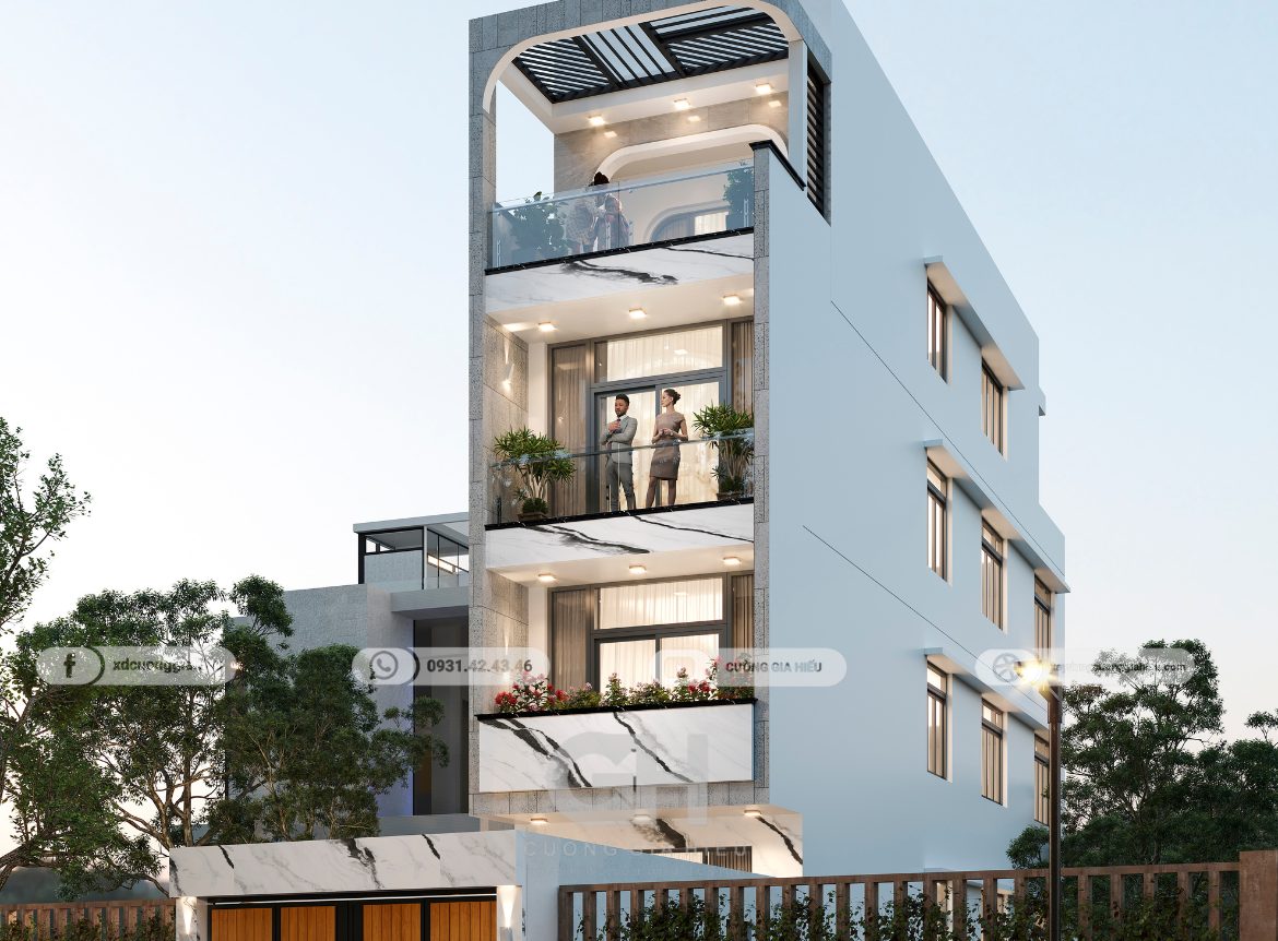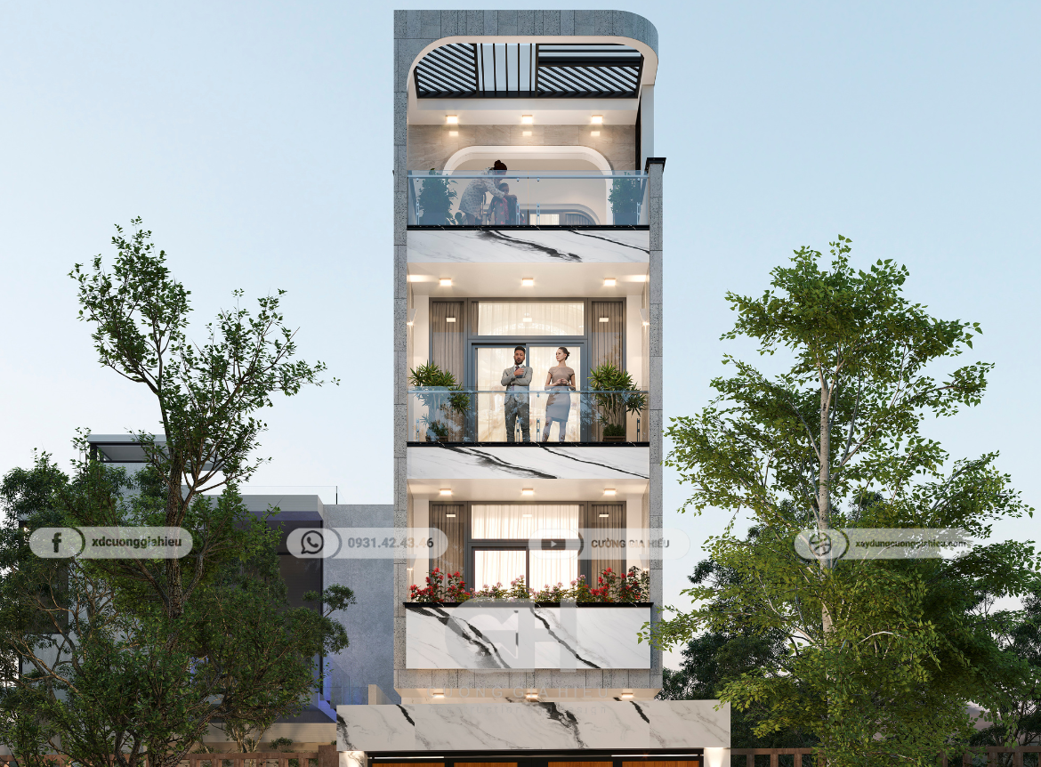 Ngay từ cái nhìn đầu tiên, mẫu nhà phố hiện đại này đã gây ấn tượng mạnh mẽ nhờ vào vẻ đẹp hiện đại, thanh lịch. Tông màu trắng chủ đạo kết hợp với các đường nét kiến trúc đơn giản, tinh tế tạo cảm giác nhẹ nhàng, sang trọng. Cửa sổ và ban công được thiết kế tối giản, tận dụng tối đa ánh sáng tự nhiên và gió trời, mang lại không gian sống thoáng đãng.