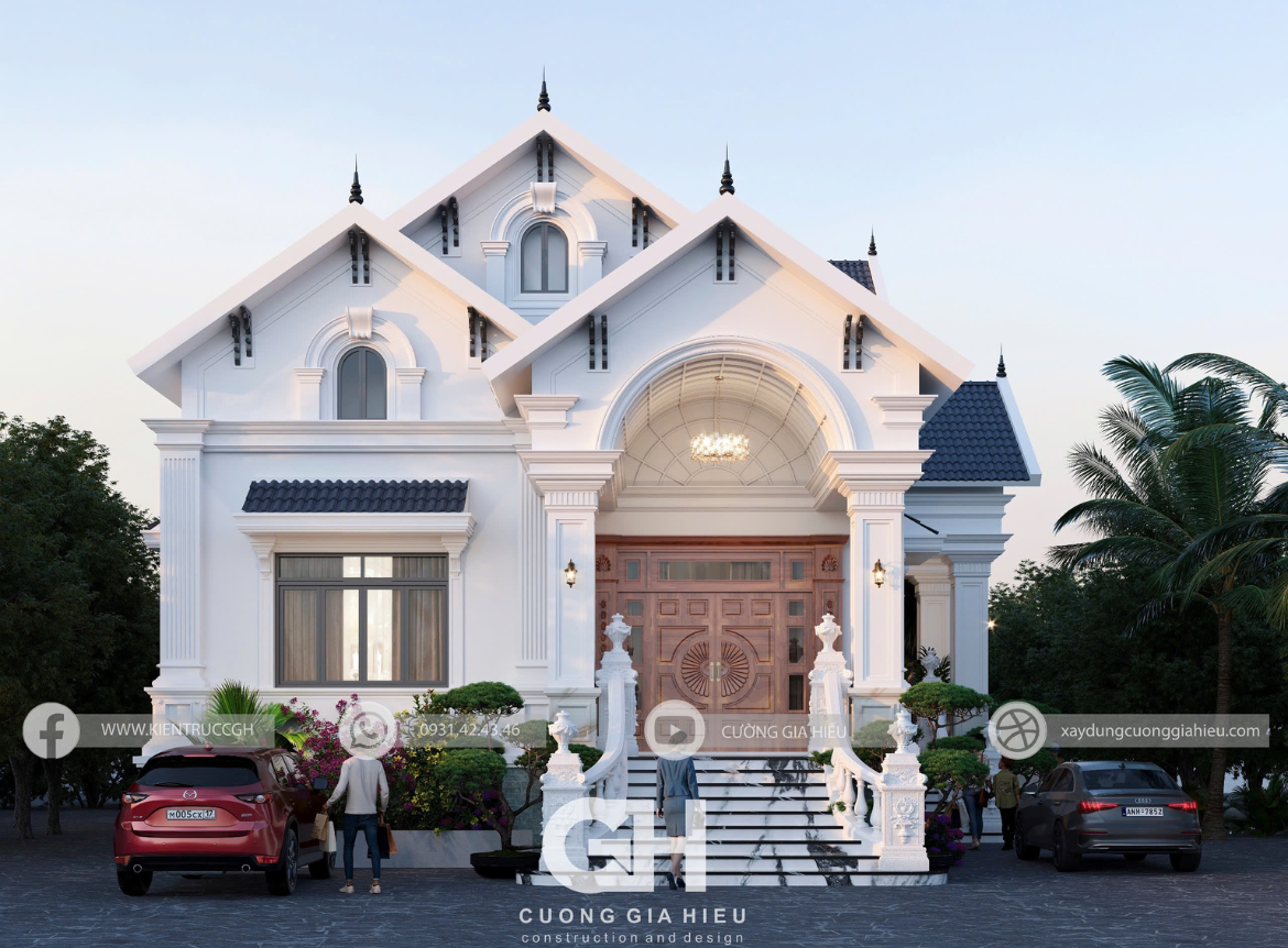 Không thể phủ nhận, mẫu nhà mái Thái luôn được nhiều khách hàng ưa chuộng tại Cường Gia Hiếu. Với hệ mái thái sang trọng chính là "linh hồn" tạo nên sức hút mạnh mẽ cho ngôi nhà. Với độ dốc lý tưởng, mái không chỉ thực hiện tốt chức năng thoát nước mưa nhanh chóng và chống nóng hiệu quả, mà còn kiến tạo một dáng vẻ bề thế, vô cùng uy nghi .Đặc biệt kết hợp với sắc trắng tinh khôi của tường nhà, tạo nên một sự tương phản thị giác đầy ấn tượng, khẳng định gu thẩm mỹ độc đáo của gia chủ.
